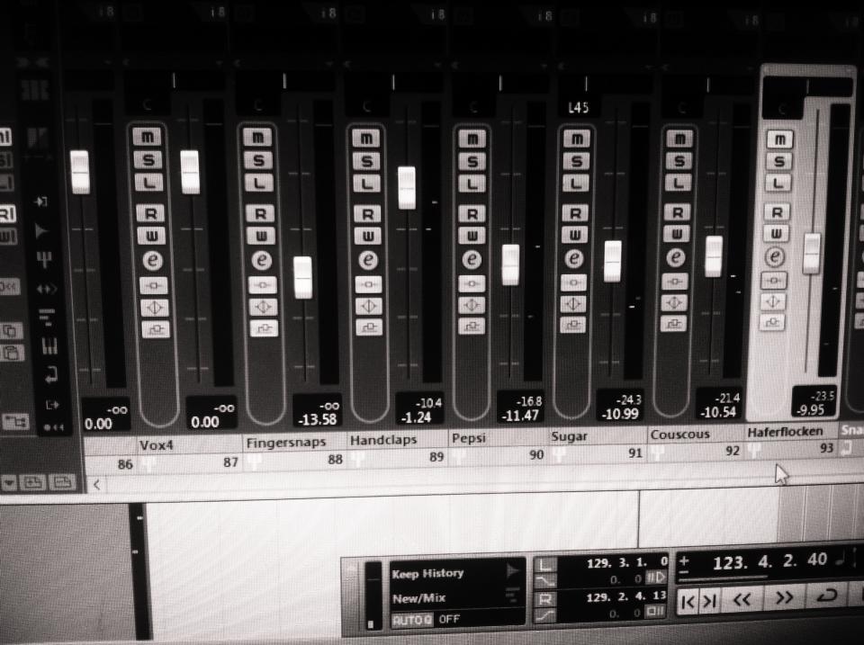 Instead of going to details about how I whipped Usva’s as three times at foosball and lost only once, maybe I should mention something about the recording method we used. We had demos of most of the tracks we are going to be recording. Victor had laid down a structure map for each of the songs beforehand, but as some of the arrangements had been improved and changed, we went through the structures together.